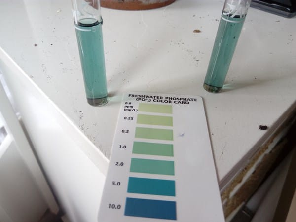 En la foto puedes ver los fosfatos del acuario a la izquierda y los del agua nueva a la derecha.