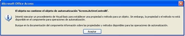 Buscando por internet lo he cambiado de todas las formas de signos y paréntesis, el objeto "Screen.AtiveControl0".