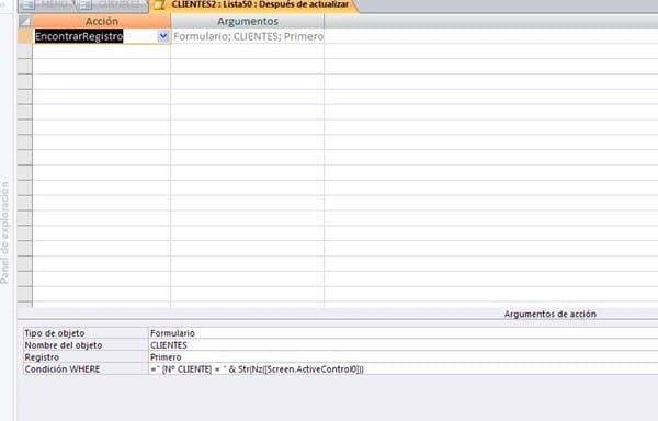 La primera foto es el formulario de clientes, luego hecho un cuadro de texto llamado TextoBuscar. El botón de comando para buscar con el nombre BUSCAR, y ya por último el cuadro de lista, que en la segunda foto es la consulta que hecho en tipo de origen de fila, la tercera foto el macro después de actualizar. Cuando busco un nombre me lo encuentra, pero al pinchar me sale este mensaje de la última foto.