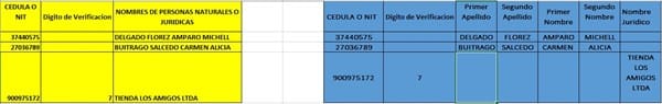 Nota: Los nombre jurídicos los coloque en una celda por aparte después del segundo nombre, siempre y cuando tenga dígito de verificación.