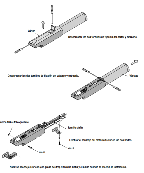 Tengo una puerta de garaje con dos hojas abatibles, cada hoja tiene su motor marca CAME, un motor abre y cierra perfectamente sin hacer ningún ruido anormal muy suavemente, pero el otro al abrir o cerrar hace un ruido como si rozase interiormente alguna pieza o estuviese haciendo un esfuerzo fuera de lo normal, he quitado la cubierta y he comprobado que el tornillo que arrastra la puerta gira perfectamente esta bien engrasado y no hay nada que impida su trabajo, el ruido continua en la zona del motor, mi pregunta es ¿cómo puedo abrir la carcasa para poder llegar al motor?, he visto varios tornillos, pero no me he atrevido a quitarlos ! No se lo que hay dentro y que puede pasar si los quito!.