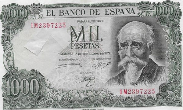 Se trata de un billete de 1.000 pesetas emisión 17 de Septiembre de 1.971-José Echegaray, al cual en el papel de impresión por estar roto se le añadió un "parche" y se imprimió sobre el mismo. El billete nunca circuló y se conserva tal y como salió del B. De España.