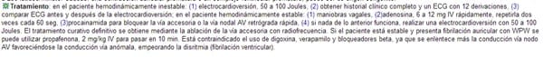 De fallar, se podrá usar Adenosina IV a dosis sucesivas de 6mg y 12mg en bolo. La Adenosina es un fármaco de muy corta vida de acción (6 segundos) y provoca un Bloqueo AV transitorio que interrumpe la taquicardia. Está contraindicada en asmáticos, Hipertensión Pulmonar y Síndrome Coronario Agudo.