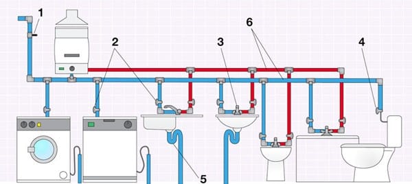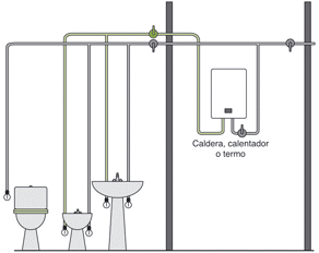 Ten en cuenta que el agua fría iría desde el contador hasta la caldera, cocina y baños derivando la misma tubería con Tes. Y el agua caliente saldría desde la caldera hasta las llaves de corte y de ahí reparte.