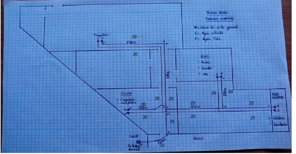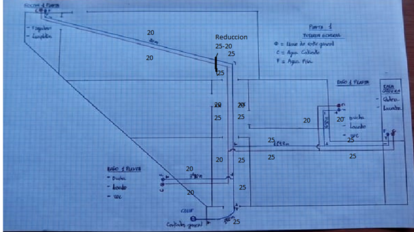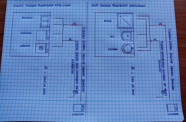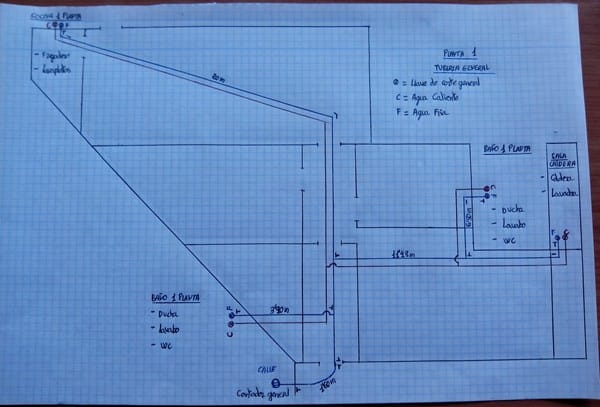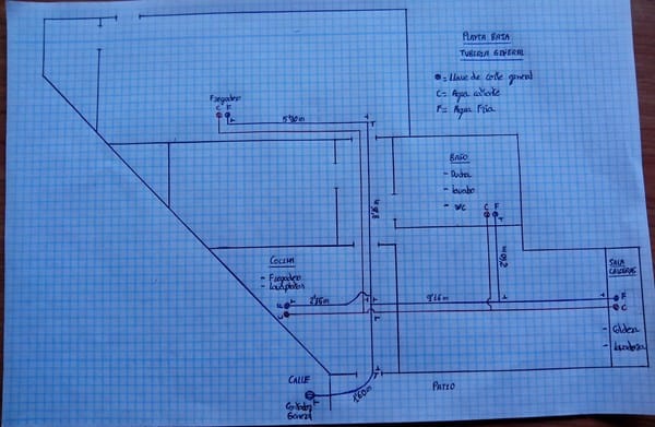 Te he hecho un plano de como van distribuidas las tuberías generales y lo que miden de largo hasta las llaves generales del baño, cocina y caldera, poniendo Tes como me dijiste.