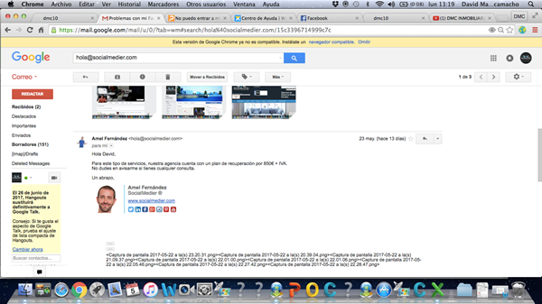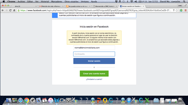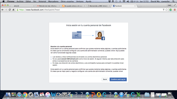 Desde hace 5 días no puedo entrar a mi facebook entro con mi correo y la contraseña correspondiente. Aparece lo siguiente : una plantilla con el titulo de UNA MANERA MÁS EFICAZ DE TRABAJAR EN FACEBOOK, Después otra que dice MUEVE TUS PÁGINAS Y CUENTAS PUBLICITARIAS, después otra de INICIA SESIÓN CON TU CUENTA PERSONAL DE FACEBOOK. Y me sale la página de ingresar el correo y una contraseña . Pero con una leyenda que dice A partir de ahora, inicia sesión con el correo electrónico y la contraseña de tu cuenta personal en lugar de usar la dirección [email protected]. Si alguien intenta iniciar sesión con [email protected], le avisaremos que asociaste estas páginas y cuentas publicitarias al inicio de sesión que figura a continuación. ( Desconozco que hacer, que cuenta y contraseña meter .) me preocupa por que esta enlazada mi página de negocio y no puedo contestar mensajes ni checar las campañas publicitarias . MI PÁGINA ES DMC Inmobiliaria ( tengo captura de pantalla)