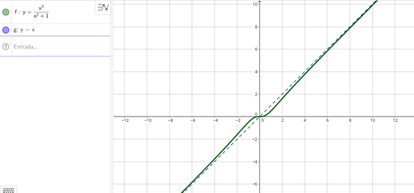 $$\begin{align}&\lim_{x \to \pm \infty} \frac{x^3}{x^2+1}=\pm \infty\\&\text{No tiene asíntotas horizontales, veamos si tiene oblicuas}\\&\text{La recta asíntota sería de la forma y=mx + b}\\&m = \lim_{x \to \pm \infty} \frac{f(x)}{x}=\lim_{x \to \pm \infty} \frac{x^3}{x(x^2+1)}=1\\&b = \lim_{x \to \pm \infty} {f(x)} - m{x} = \lim_{x \to \pm \infty} \frac{x^3}{x^2+1}-x=\\&\lim_{x \to \pm \infty} \frac{x^3-x(x^2+1)}{x^2+1}=\lim_{x \to \pm \infty} \frac{x^3-x^3-x}{x^2+1}=\\&\lim_{x \to \pm \infty} \frac{-x}{x^2+1}=0\\&\text{Por lo tanto la asintota oblicua es }y=x\end{align}$$