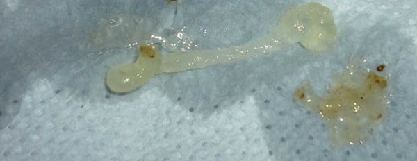 Ainoa, creo que puede tratarse de una úlcera de recto o colon irritable, porque lo que has visto parece ser sólo un poco de mucosidad, señal inequívoca junto con la sangre de que existe un principio de úlcera o herida en el recto o colon, tiene este aspecto