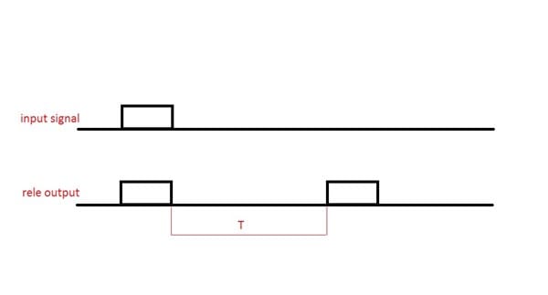 Tengo un videoportero que me activa un relé para cerrar la puerta, que al pulsar el boton abrir/cerrar cierra el circuito de la puerta. Necesito un relé que se active al darle señal y pasados X minutos me vuelva a activar. Adjunto una imagen de la señalar que le metería yo y el comportamiento que quiero. Al poder ser a 12v