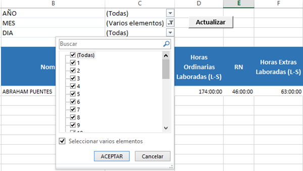 Tengo una tabla dinámica en esta pongo filtros por año, mes y día, lo que sucede es que necesito filtrar por dos meses, pero del mes 1 necesito seleccionar los últimos 5 días y del mes 2 los primeros 5 días. Cómo puedo ajustar el filtro para poder realizar esto. El filtro me muestra el total de dias del mes, si selecciono solo los 5 primeros días, me seleccionara los 5 primeros días de cada mes. Necesito el filtro por mes. ¿Cómo lo hago?