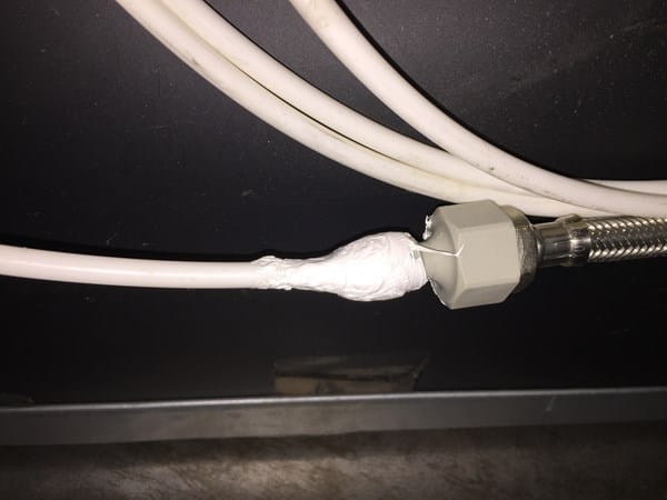 Y este es el otro final del tubito, que es por donde pierde agua, aunque ahora está desconectado; como ves, roscado al plástico va el manguito flexible para conectar al grifo. Le he echado silicona que pega y sella; me lo vendieron en Leroy Merlin, y en teoría serviría, pero probé la semana pasada y al conectar el agua se volvía a salir. Ahora tengo un pegote y voy a esperar hasta el lunes para conectarlo, a ver si se ha secado y endurecido suficiente y me sirve. La idea era cambiar el tubito de plástico entero, pero soy incapaz de quitarlo, y tampoco sé si aflojando el tornillo no tendré algún otro problema dentro de la bombita o lo que sea.