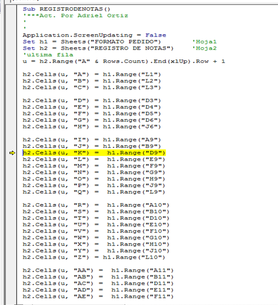 sheets("registro de notas").range("k" & inewrow) = sheets("formato pedido").range("d9").value