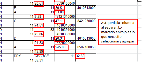 Use la opción "Texto en Columnas" para separar cada elemento en su respectiva celda pero ahora están todos regados y necesito seleccionar y agrupar los valores que me interesan en una sola columna.