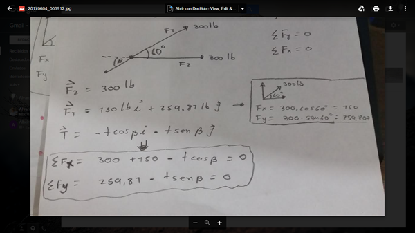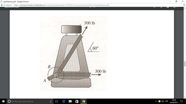 Durante una prueba de impacto de un automóvil, el cinturón de seguridad soporta tensiones de 300 lb. Considerando la hebilla B como una part´ıcula, determine la tensión T en la correa AB y el ángulo que hace la tensión con el eje horizontal.
