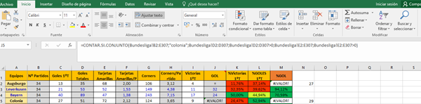 Estoy intentando construir una base de datos relacionada con el deporte, en particular, el fútbol. Mi problema viene cuando intento, mediante una fórmula, contar el número de partidos de "X "equipo en el cual han conseguido marcar ambos equipos. Lo intento hacer con la función "contar.si.conjunto", pero después de introducir las celdas me da error o 0, por lo que supongo que estaré introduciendo la fórmula equivocada. He probado también ha introducir la función "Y", sin éxito.