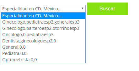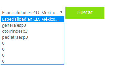 <SELECT NAME="buscar"> <option>Especialidad en CD. México...</option> <?php $conexion=mysql_connect("localhost","user","passw") or die("Problemas en la conexion"); mysql_select_db("medica",$conexion) or die("Problemas en la selección de la base de datos"); mysql_query ("SET NAMES 'utf8'"); $clavebuscadah=mysql_query("select esp1, esp2, esp3 from especialidades WHERE (estado='CD. MEXICO')",$conexion) or die("Problemas en el select:".mysql_error()); while($row = mysql_fetch_array($clavebuscadah)) { echo'<OPTION VALUE="'.$row['esp1'].'">'.$row['esp1'].','.$row['esp2'].','.$row['esp3'].' </OPTION>'; } ?> </SELECT> <input class="button button-action button-rounded" type="submit" value="Buscar"/> </form>
