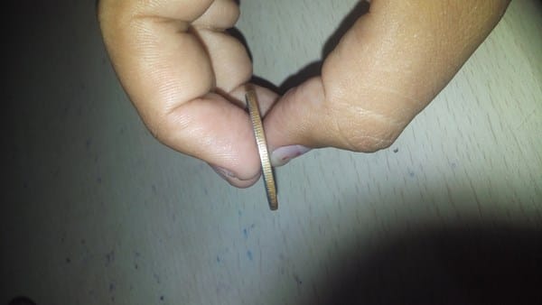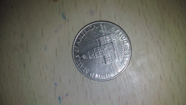 El costo de una moneda de níquel, en ella sale el rostro del presidente Kennedy debajo del rostro las fechas 1776-1976 en la otra cara de la moneda el edificio de independencia, los bordes de la moneda están un poco gastados pero el rostro de Kennedy y el edificio están en perfecto estado.