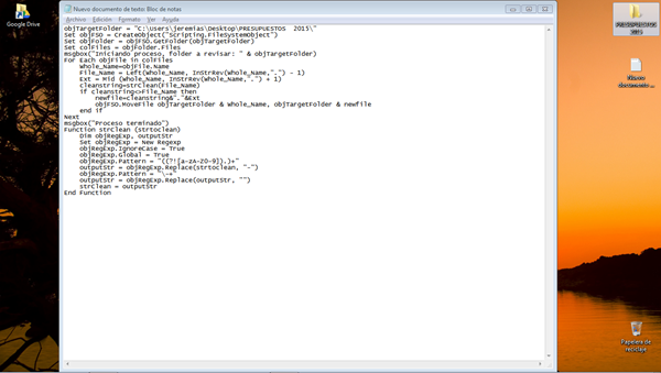 Para ejecutar el archivo .bat, copia y pega el código enviado por gggriald en un archivo de block de notas, cambias por el folder en la segunda línea, por el folder donde se contienen los archivos cd "d:\Carpeta prueba" y al guardar lo haces con extensión .BAT o .CMD, también puede ser en el escritorio... OJO El proceso mediante archivo .BAT es necesario que renobres el folder orifginal que no tenga espacios ya que no son válidos para el comando cd... renombra tu folder de "presupuestos 2015" a "presupuestos2015" (sin comillas) - Leo Gonzalez
