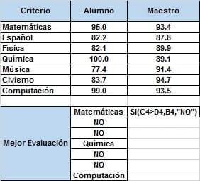 Nuevamente solicito de su apoyo, tengo dos tablas una donde hay materias y calificaciones de alumnos y maestros, necesito identificar en que casos el alumno salio mejor evaluado que el docente, eso lo muestro en la tabla de abajo, la formula que ocupe es la que esta al lado de donde dice MATEMÁTICAS.
