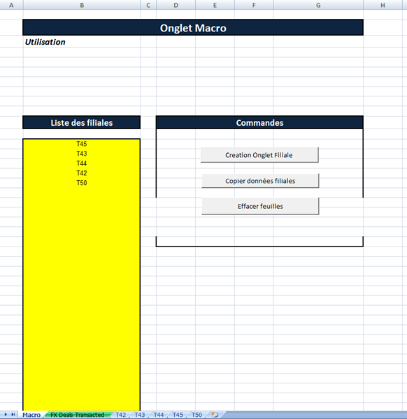 1) Macro "Creation Onglet Filiale": Te permite crear las hojas para cada subsidiaria mediante una lista al cual se adjunta las subsidiarias --> Hoja "Macro"--> Columna B --> Fila 13, 14, 15...