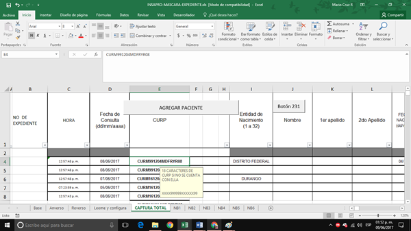 Necesito una macro en la que al colocar un valor -(que siempre es igual a 18 dígitos) en la celda "E4" DE LA HOJA "CAPTURA TOTAL"