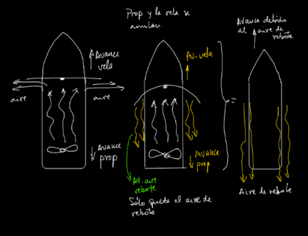 Fernando... lo que te dice Mario Gomez es importante. Lo único que esta actuando contra el medio ( atmósfera) es el chorro de aire expulsado por el fuelle. Luego si el chorro es fuerte vos y el bote se moverán hacia atrás de la misma manera que un globo abierto se desinfla y sale disparado contrariamente al sentido del aire que escapa. - albert buscapolos Ing°