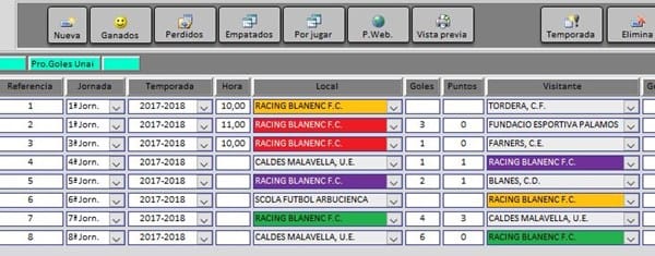 Ganados color verde, perdidos rojo, empatados lila, por jugar amarillo