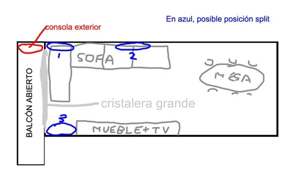 Por otro lado ¿dónde pondriais el split? Nos da un poco de palo ponerlo en mitad del salón... ¿si lo dejamos pegado a una esquina en la pared principal, ¿será menos eficiente? Adjunto foto... Bueno, dibujo con photoshop...