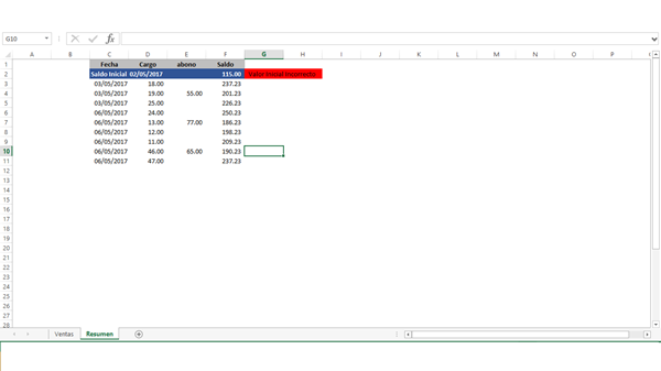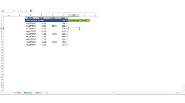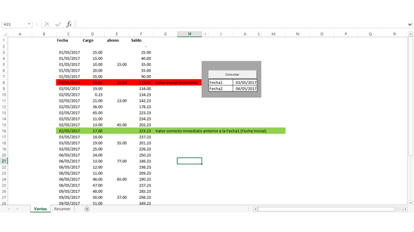 Lo que quisiera es encontrar una forma que la macro recoja el primer valor Inmediato anterior a la fecha inicial, es decir la fecha que está arriba de la fecha Inicio así como se ve en la primer imagen en relleno color verde y la pegue en la hoja Resumen en el rango que se le indique.