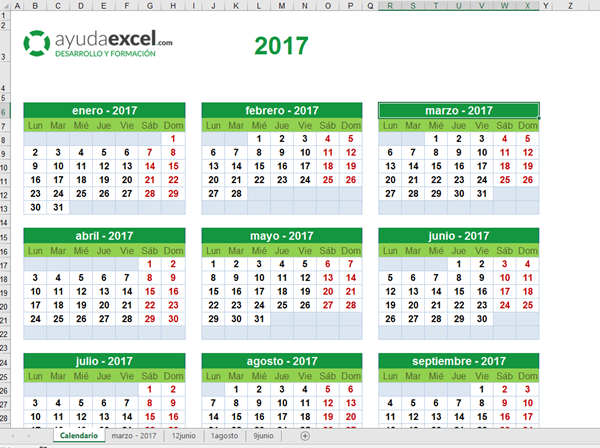 Por lo normal solo estarían visible la hoja calendario las demás las tengo ocultas. Y tengo los siguientes códigos: