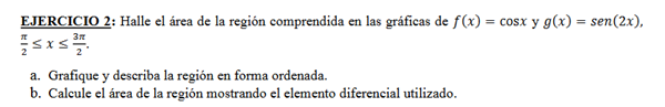 $$\begin{align}&Area = \int_{\pi/2}^{5/6 \pi} \cos(x) - sen(2x) dx + \int_{5/6 \pi}^{3/2 \pi} sen(2x) - \cos(x) dx=\\&\bigg( sen(x) + \frac{1}{2}\cos(2x)\bigg|_{\pi/2}^{5/6 \pi}\bigg) + \bigg(-\frac{1}{2}\cos(2x) - sen(x)\bigg|_{5/6 \pi}^{3/2 \pi} \bigg)=\\&\bigg( sen(\frac{5 \pi}{6}) + \frac{1}{2}\cos(\frac{5 \pi}{3})\bigg)-\bigg(sen(\frac{\pi}{2}) + \frac{1}{2}\cos( \pi)\bigg) + \bigg(-\frac{1}{2}\cos(3 \pi) - sen(\frac{3 \pi}{2})\bigg)-\bigg(-\frac{1}{2}\cos(\frac{5 \pi}{3}) - sen(\frac{5 \pi}{6})\bigg)=\\&sen(\frac{5 \pi}{6}) + \frac{1}{2}\cos(\frac{5 \pi}{3})-sen(\frac{\pi}{2}) - \frac{1}{2}\cos( \pi)-\frac{1}{2}\cos(3 \pi) - sen(\frac{3 \pi}{2})+\frac{1}{2}\cos(\frac{5 \pi}{3}) + sen(\frac{5 \pi}{6})=\\&2sen(\frac{5 \pi}{6}) + \cos(\frac{5 \pi}{3})-1 + \frac{1}{2}+\frac{1}{2} + 1=\\&1 + 0.5+ 1=2.5\end{align}$$Notas: