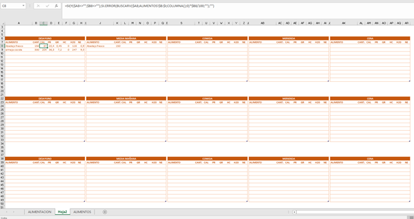 En las demás columnas no he conseguido que me funcione la formula no he sido capaz de adaptarla. Espero que alguien me pueda ayudar con este tema para adaptar la formula a las demás comidas del día.