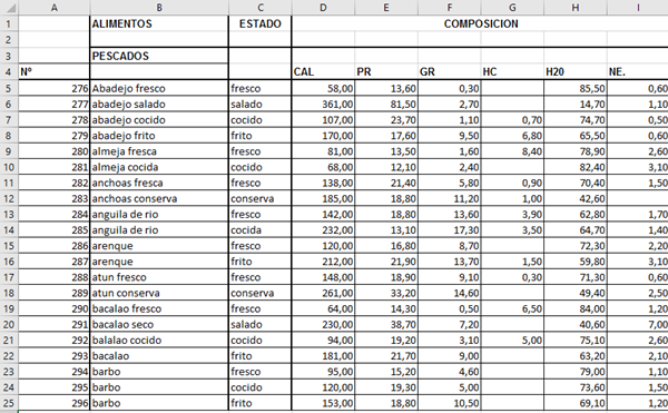 Tengo un excel con una hoja llamada "ALIMENTOS" con algunos de sus nutrientes, como se ve en la imagen de abajo:
