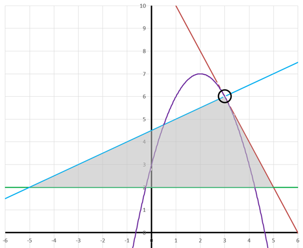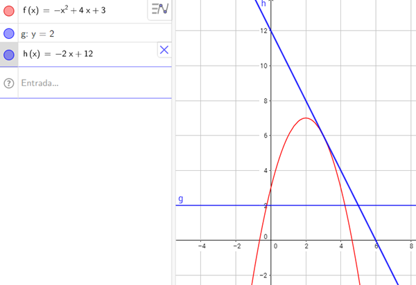 La línea de color lila es la parábola (f(x)=-x*x+4x+3). La recta verde es y=2.
