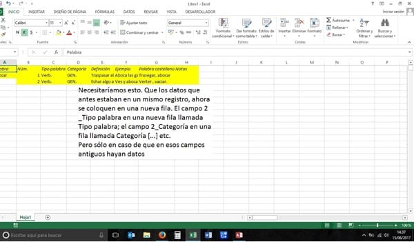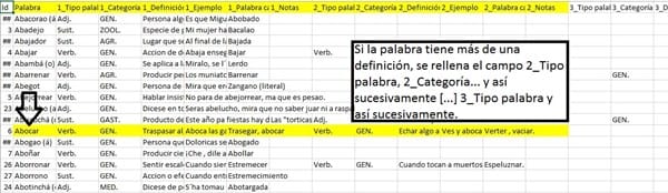 El primer problema nos surgió cuando nos dimos cuenta de que cada palabra puede tener varios usos muy diferentes. Algunas sólo tendrán un significado pero otras pueden tener muchos. Ante ese problema decidimos añadir esos mismos campos al mismo registro. Es decir, cada registro tiene varios "Tipo de palabra", "Categoría", "Definición" etc. Añadiéndole a cada campo un número delante, p.ej.: "1_Categoría".