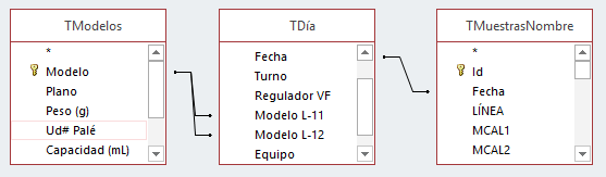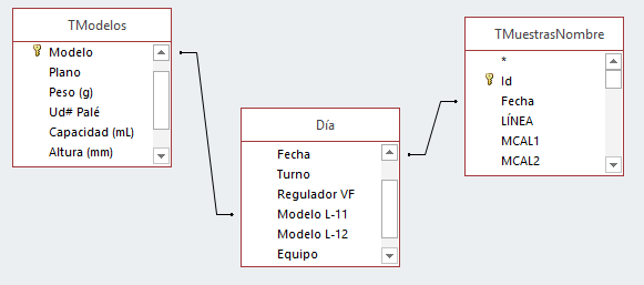 En TDía tengo un campo llamado Fecha, otro llamado Modelo11 (el modelo en una de las líneas) y en otro campo tengo el campo Modelo12 (el modelo de la otra línea), ambos están relacionados con [TModelo][Modelo].