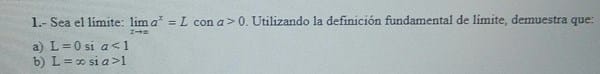 CálculoMatemáticas ana paola el 21 jun. 17 Limites utilizando su definición formal Como demostrar los apartadoa a y b mediante la definición formal de límite, teniendo en cuenta si a<1 o a>1 Seguir Siguiendo Dejar de seguir