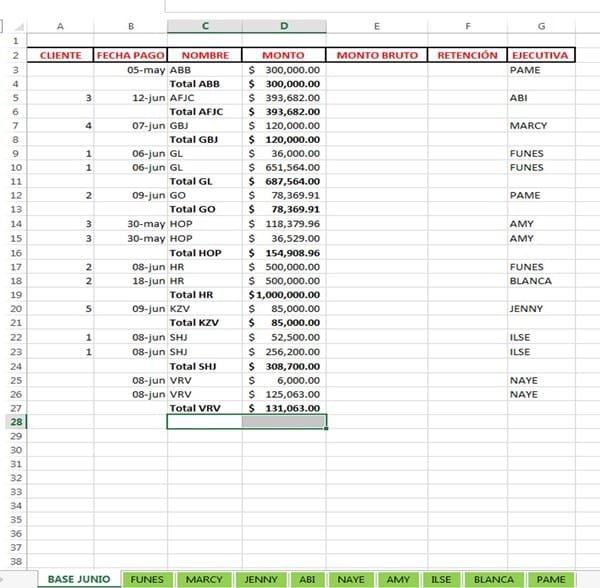 Me podrían ayudar por favor tengo una base de datos la cual necesito acomodar por orden alfabético y después sacar un subtotal del monto por cada cambio en el nombre me ayudan a hacerlo automático por favor mando ejemplo de mi hoja