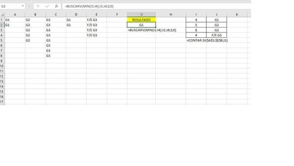 Lo que necesito es que, en otra celda, yo determinar según los valores de la tabla (son 6 columnas con dichos resultados) cual es el menor de todos estos. Si hay 5 de esas columnas con el valor G1 y una sola con G3, la celda objetivo debería espeficiar G3. Es decir el menor de la jerarquía que plantee.