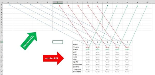 El dato A1 en Excel se asentaría en la celda Text13 del PDF, A2 en Excel Text14 PDF, etc