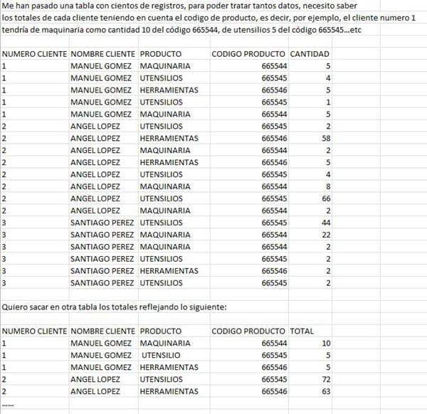 Me han pasado una tabla con cientos de registros y necesito sacar de esa tabla los valores únicos de cada registro y la suma total con relación a los clientes, a continuación pongo una imagen que lo deja más claro, muchas gracias.