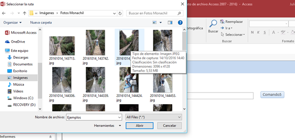 Hace años que empecé a usar Access, y aunque aún no sé de código, me manejo con soltura en otras cuestiones del programa (siempre con ayuda). Tengo numerosas bases de datos creadas con este software. Ahora que tengo más tiempo he vuelto a retomar mi última base, la cual es una galería de fotos. Tengo creados los campos necesarios, las relaciones, etc.