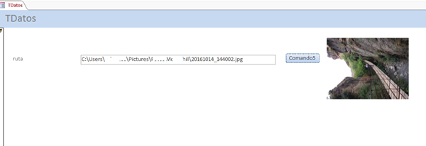 Vamos a suponer que tienes una tabla Alumnos con Idaumno, nombre,... y un campo Ruta, En el formulario, si quieres puedes poner el cuadro de texto Ruta como oculto. Añádele un control imagn que supondremos que se llama imagen8. En el editor de VB pega esta función
