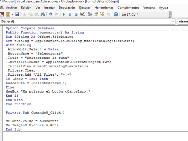 Lo que me explicaste en un primer momento lo entendí y así lo hice, tal como muestras en tus imágenes posteriores. No obstante, salta un error cuando pulso en el Comando5 (mi botón, que por cierto, en tu primera exposición me dices que añada el código en cualquier evento del formulario, pero yo he entendido que había que añadírselo al evento "hacer clic" de un botón) y salta Error de compilación. No se ha definido la variable. No entiendo qué quiere decir. He puesto tu código, lo que no sé es de dónde proviene "buscaruta".