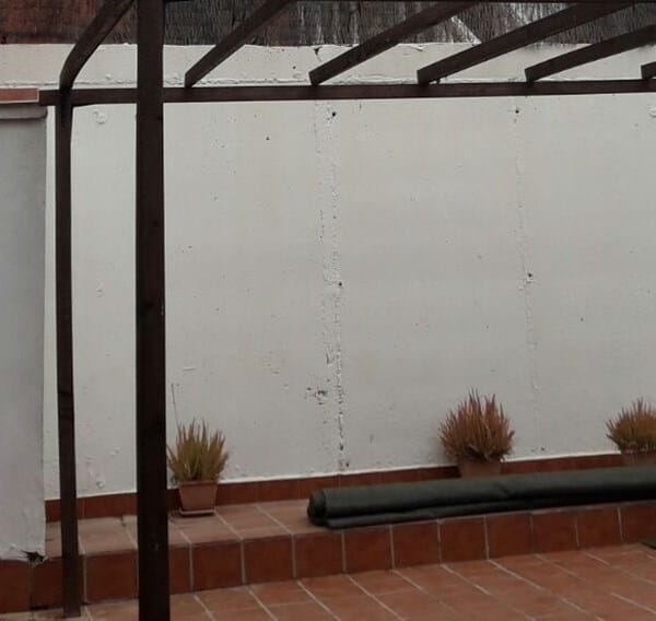 En el patio de mi vivienda tengo un muro de hormigón que divide las parcelas y sostiene el desnivel entre viviendas. Mi vecino tiene piscina y cuando rebosa o cuando llueve con mucha intensidad, el agua sale abundantemente por los orificios que tiene el muro y por las fisuras o grietas del enlozado del patio.
