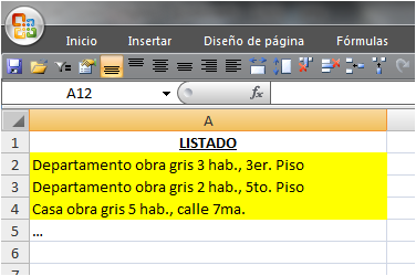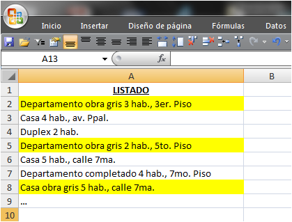 Listado (coloqué en amarillo las celdas relevantes solo para visualizar más fácilmente en este ejemplo, en un caso real no estarían resaltadas):