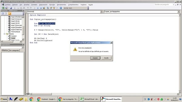 Tengo un código que utilizo en otro libro para copiar una celda al portapapeles de Windows, de forma que esté disponible aún cuando ya haya cerrado la hoja de cálculo. Mi problema es que, al adaptarla al libro donde quiero usarla, seleccionando en este caso un rango dinámico, me da el error de que no se ha definido el tipo definido por el usuario. Aquí está el código: