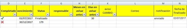 Para Dante Amor. Hola Dante, en la columna F tiene la formula : =+SI(D2=1;"Finalizado";SI(E2>1;E2-HOY();"")). Necesito que cuando el resultado sea "Finalizado" en F, me ponga en N la fecha de hoy(), pero como valor y que no se modifique mañana. En la lista puede haber muchos que ya finalizaron y con distintas fechas, a esas tampoco las modifique. Tendria que ser un condicional que si en N esta vacio y en F dice "finalizado " ponga la fecha de hoy en N, pero no me sale! Abrazo