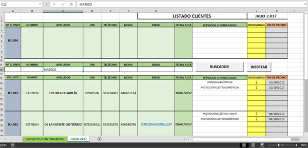 Tengo la tabla superior con datos de A4 a K9 (En las columnas A a la H solo en la fila 6), en la columna I son listas en las que puedes optar entre 1 a 6 productos, que en función de los que elijas tienen un plazo de vigencia de 2 o de 6 meses. La macro para insertar los datos a partir de A15 y que se renumeren los códigos de clientes ya está. Lo que quiero ahora es preparar un botón buscador para que a introducir LOS APELLIDOS en la celda C12 me busque a lo largo de los datos registrados y me copie los datos de los campos de las celdas A11 a H11 que correspondan con ese valor en LA MISMA HOJA. ¿Si quiero hacer los mismo en sucesivas hojas mensuales tendría que adaptar la macro de esta hoja a las demás, no?
