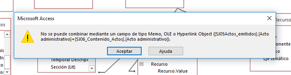 [SJ06_Contenido_Actos].[Acto administrativo] es el valor dependiente de la otra tabla que se obtiene por búsqueda del otro. Pero ninguna de las configuraciones de las filas se seleccionó Memo, Ole o Hyperlink. Dice texto corto. No se que hacer, he intentado, todo lo que está a mi alcance.